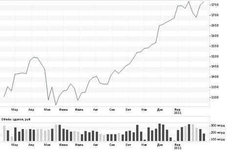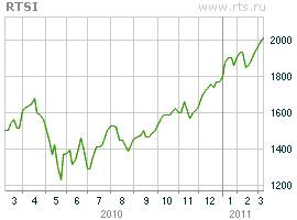 Российский ММВБ закончил торги в Среду 02/03/2011 ростом в +0,39%, достигнув 1 765,38 пункта. Суммарный объем торгов 796,76 млрд. руб. или $27,71 млрд. [MICEX]