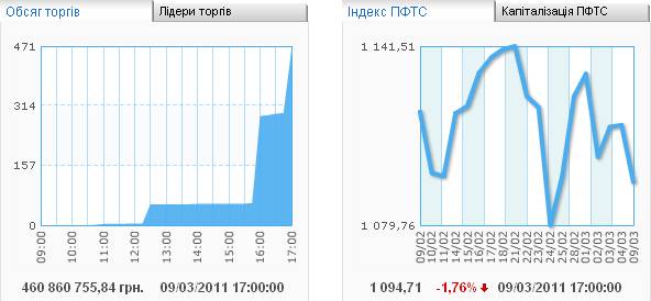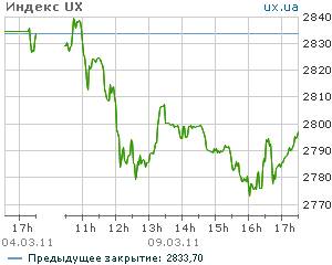 В Среду 09/03/2011 индекс UX, рассчитываемый "Украинской Биржей" по завершению торгов составил -1,29% и снизился до значения в 2 797,21 пункта.