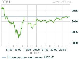 Индекс РТС на вечерней сессии в Среду 09/03/2011 после спада (-0,64%) основных торгов, отрицательно продолжил тренд, составив 2 012,06 пункта убавил от дневной сессии -0,01%. Общий объем сделок составил $7,49 млрд.