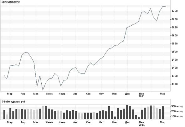 Российский индекс ММВБ закончил торги в Среду 09/03/2011 спадом в -0,08%, достигнув 1 779,24 пункта. Суммарный объем торгов 827,67 млрд. руб. или $29,379 млрд. [MICEX]