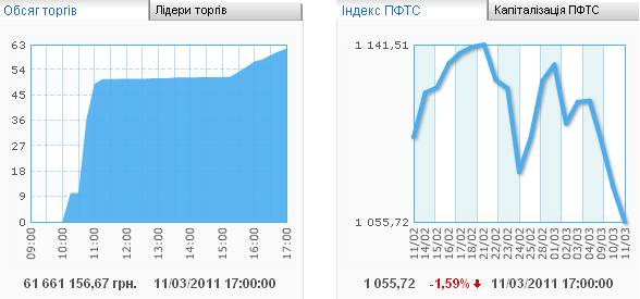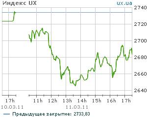 В Пятницу 11/03/2011 индекс UX, рассчитываемый "Украинской Биржей" по завершению торгов составил -1,85%  и снизился до значения в 2 683,27 пункта.