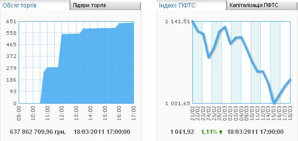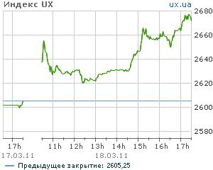 В Пятницу 18/03/2011 индекс UX, рассчитываемый "Украинской Биржей" по завершению торгов составил +2,55% и вырос до значения в 2 671,63 пункта.
